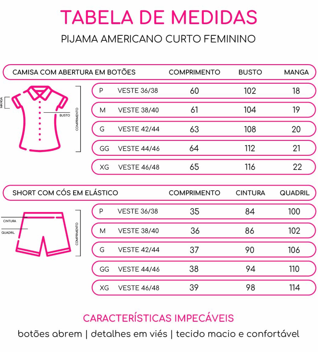 Descubra o Pijama Americano Débora, feito em Viscolycra leve e macio, que proporciona a combinação perfeita de conforto e elegância. Com botões que abrem e cós em elástico, esse pijama se adapta ao seu corpo, garantindo liberdade de movimento e um ajuste perfeito.